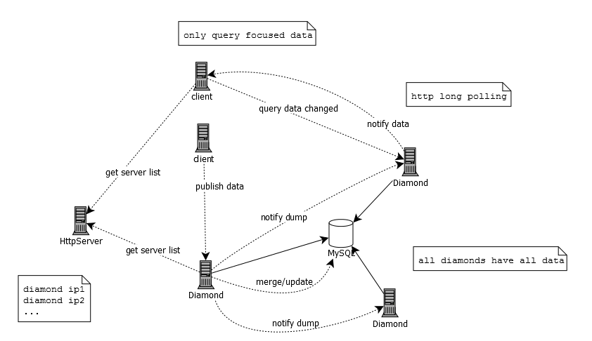 客户端库中以固定时间间隔从服务器拉取数据(ClientWorker::ClientWorker,ClientWorker::checkServerConfigInfo)。只有应用方关心的数据才可能被拉取。另外,为了数据推送的及时,Diamond还使用了一种long polling的技术,其实也是为了突破HTTP协议的局限性。如果整个服务是基于TCP的自定义协议,客户端与服务器保持长连接则没有这些问题。