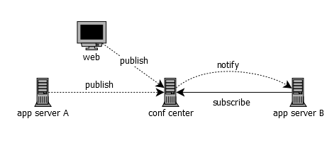 分布式配置管理的本质基本上就是一种推送-订阅模式的运用。配置的应用方是订阅者,配置管理服务则是推送方。概括为下图:
