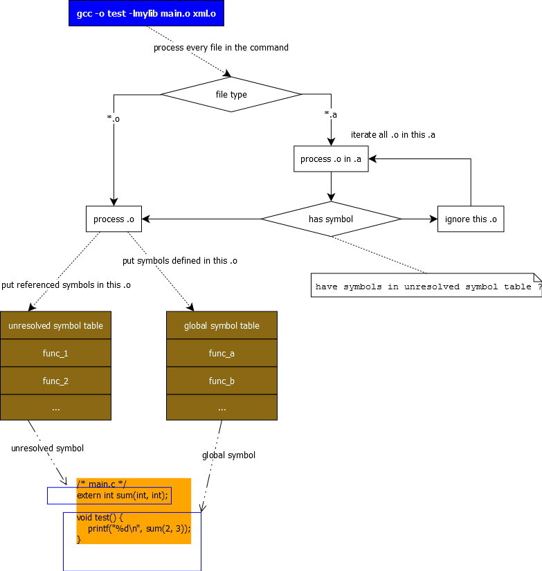 链接器在链接静态库时,同链接一般的.o基本相似。链接过程大致可以归纳下图: