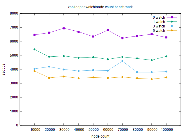 可见,watch对写操作还是有较大影响的,毕竟需要进行网络传输。同样,这里也显示出整个zookeeper的watch数量同节点数量一样对整体性能没有影响。